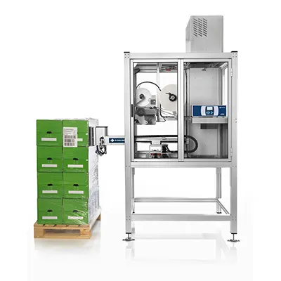 Der Palettenetikettierer kann mit einem oder zwei Stopps mehrere Etiketten in verschiedenen Größen auf einer Palette anbringen. Des Weiteren lässt er sich an Ihre Anforderungen anpassen und einfach in Ihre bestehende Produktionslinie integrieren. Dank des robusten Druckers mit 600 m langen Farbband- und Etikettenrollen, die synchronisiert sind, damit sie gleichzeitig ausgetauscht werden können, und einer intuitiven Touchscreen-Benutzeroberfläche können Sie Ihren Palettenetikettierungsprozess in einem Bruchteil der Zeit abschließen, die sie für das manuelle Aufbringen von Etiketten benötigen würden, und dadurch Gesamtkosten senken.