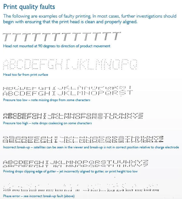 Most coding errors are born from simple wear and tear on your industrial printer. For example a misaligned print head can cause phase errors, incorrect breakups and missing drops. Other causes of print errors stem from misuse of the coder or inappropriate installation.