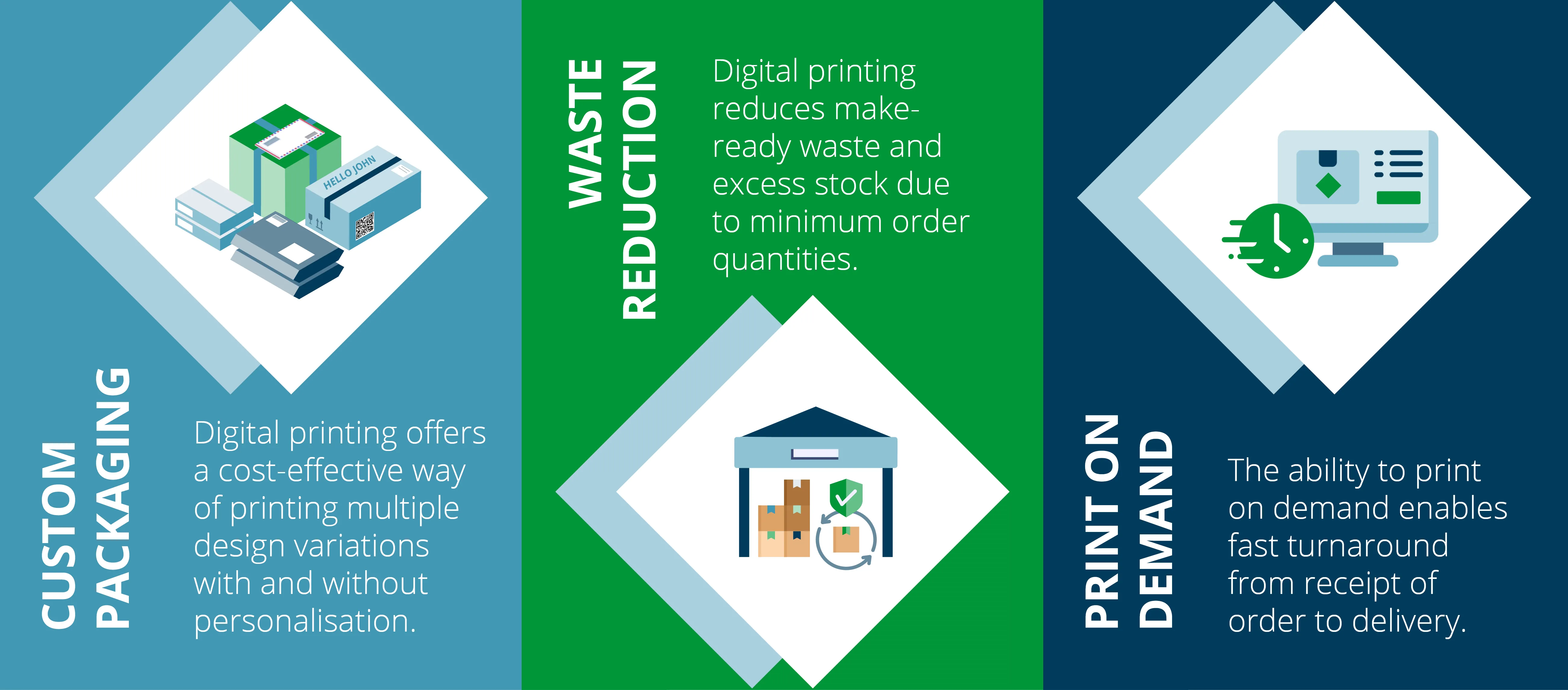 Digital printing is an excellent option for branded ecommerce packaging. It is also increasingly used as a cost-effective option for producing short and medium runs of variable packaging designs, such as promotional, seasonal, and limited-edition retail packaging. Adding variable data such as regional language versions, or serialised QR codes, is a key application of digital printing for packaging.