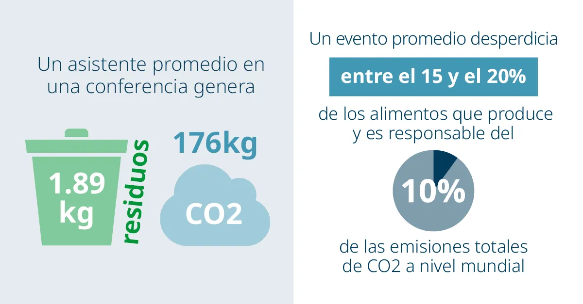 La industria de los eventos es responsable de grandes cantidades de residuos y emisiones. El evento promedio desecha entre el 15 y el 20 % de todos los alimentos que produce[i], y el asistente medio a una conferencia genera 1,89 kg de residuos (de los cuales 1,16 kg acaban en vertederos) y más de 176 kg de emisiones de CO2 diarias[ii]. En 2022, se estimó que la industria de los eventos fue responsable del 10 % de las emisiones globales de CO2, lo que equivale a las emisiones anuales de EE. UU.[iii].