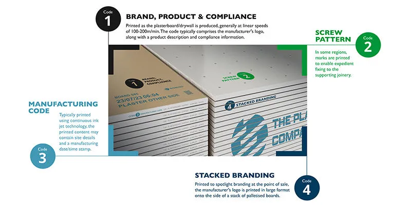 Como ocurre en muchos otros sectores, en la construcción es necesario codificar los materiales, como las placas de yeso (también conocidas como «pladur»), para que puedan identificarse. Por lo general, es necesario incluir los códigos de fabricación con el origen, la fecha y la hora de producción, y los números de lote. Ese tipo de código se emplea para la identificación del producto y su trazabilidad una vez que sale de la fábrica. Además, el cliente también puede codificar a alta resolución los detalles del producto y de la marca, tanto en cada unidad como en los palés para ofrecer una imagen de marca de mayores dimensiones, p. ej., su logotipo.